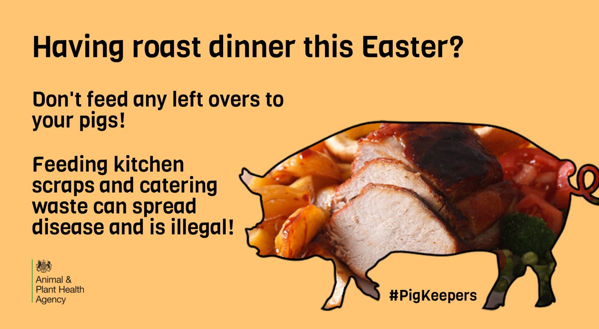 #Pigkeepers: This Easter please don't feed your pigs your Easter roast lunch left overs! It is illegal to feed catering waste of any description or domestic food waste to farm animals in the UK, including pet pigs as it can spread devastating diseases. https://www.gov.uk/government/news/pig-keepers-warned-not-to-feed-kitchen-scraps-to-pigs-due-to-african-swine-fever-risk …pic.twitter.com/OOS6I8QppT