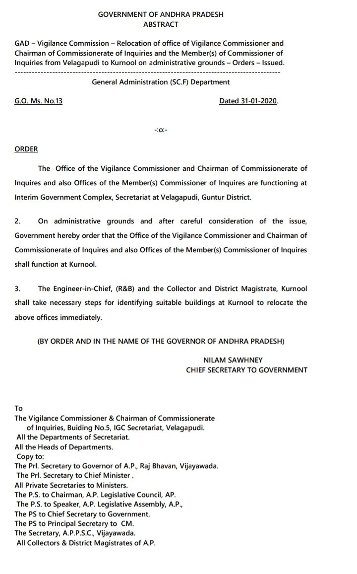 విజిలెన్స్ కమిషన్ కార్యాలయం వెలగపూడి నుండి కర్నూల్ కి మార్చారు. GO 13