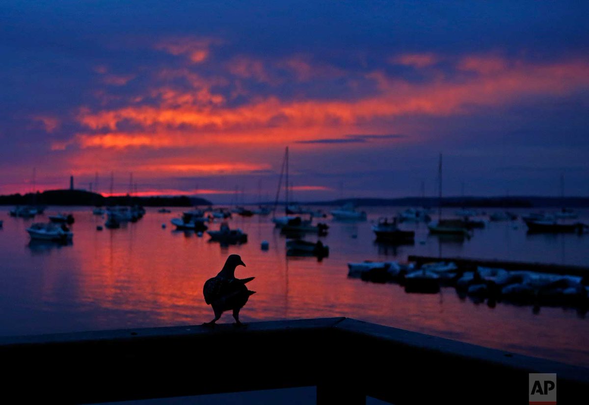 A pigeon has a perfect perch to watch the first light of dawn color the sky over a harbor today in Falmouth, Maine. Photo Robert F. Bukatypic.twitter.com/RLH5gpb1s8