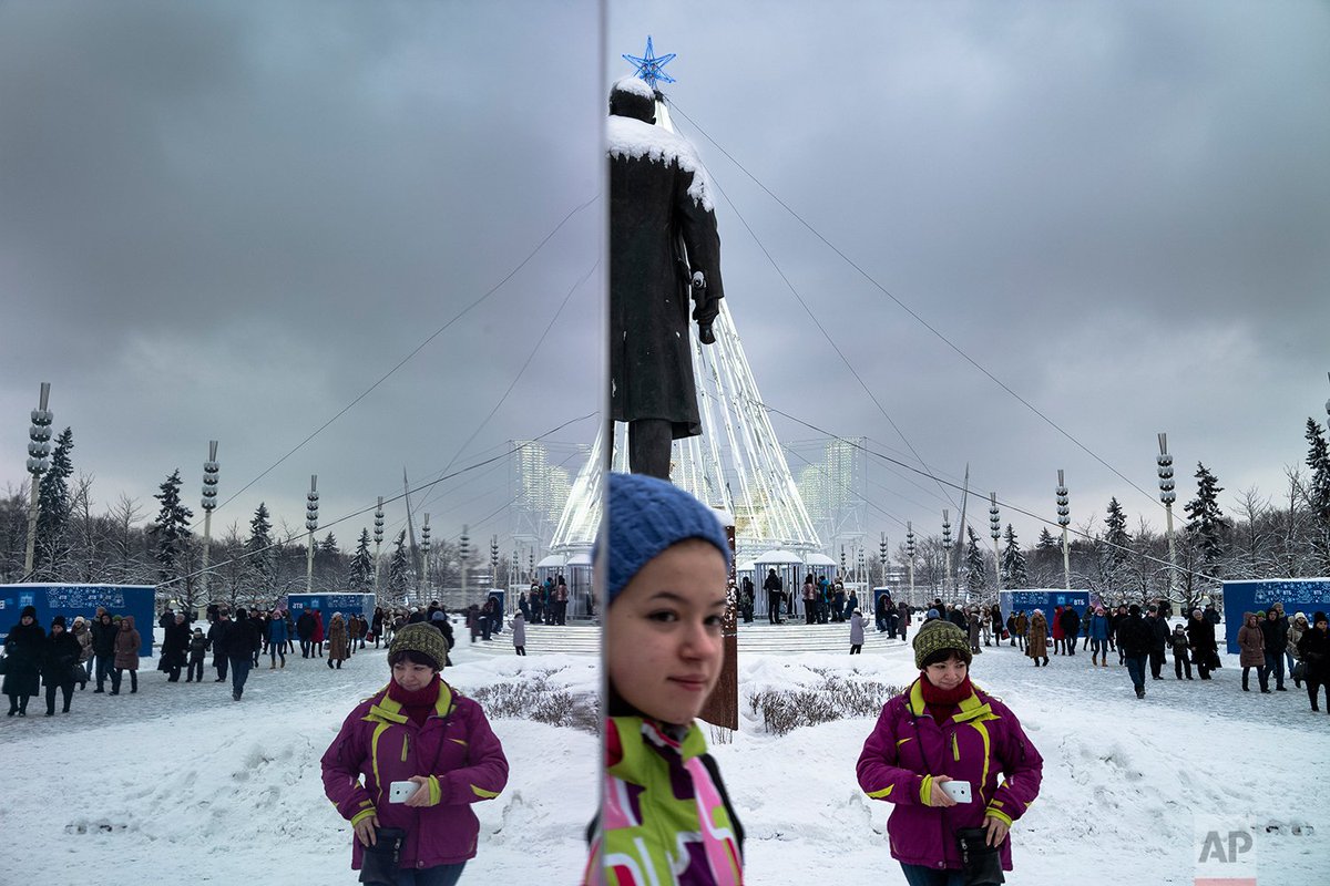 People take photos with cell phones as they walk between mirror installations at VDNKH (The Exhibition of Achievements of National Economy) in Moscow, Russia.