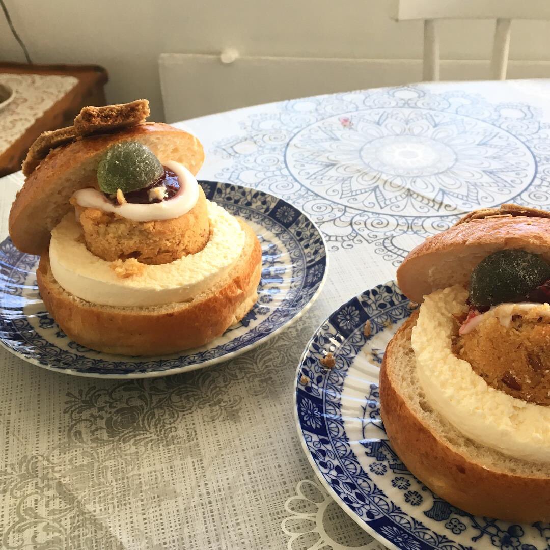 Parin vuoden takainen laskiaispulla mantelimassalla, kermavaahdolla, runebergintortulla, hillolla, vihreällä kuulalla ja piparkakulla. Mikäs olis tän vuoden laskiaispulla?