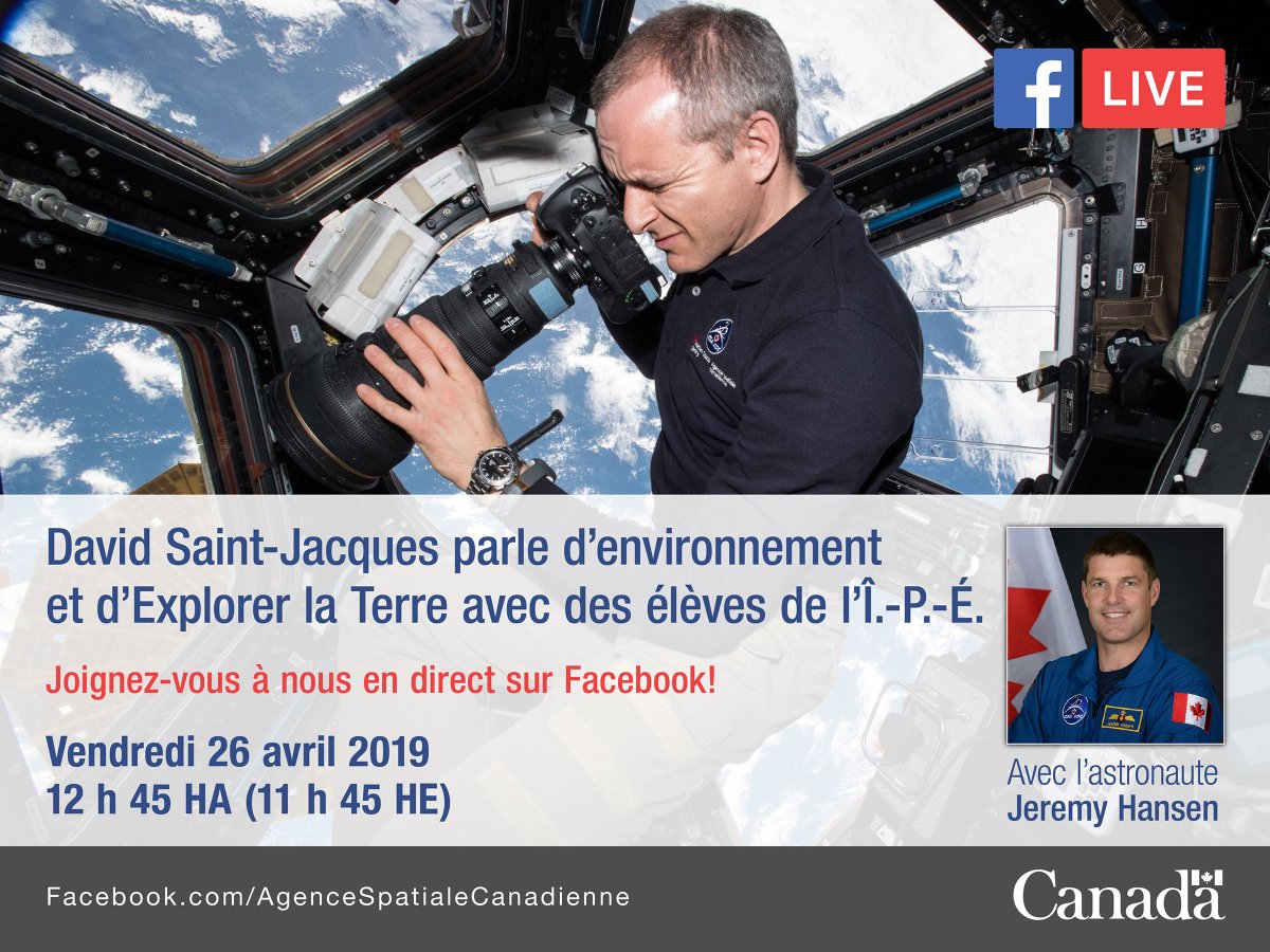 @Astro_DavidS discutera d'environnement et de la vie à bord de la SSI en direct de l’espace avec les 800 élèves de l’école Stonepark de l'Île-du-Prince-Édouard, gagnante de notre concours#ExplorerlaTerre!pic.twitter.com/DkZwqj45Jh