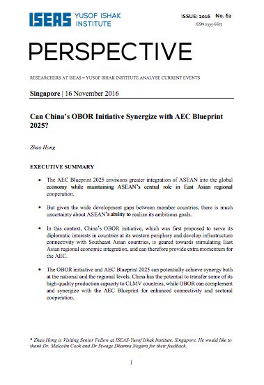 *From our member Thursday* Can #China’s #OBOR Initiative Synergize with #AEC Blueprint 2025? Full text @ISEAS : http://ow.ly/wokR307mzGU pic.twitter.com/oHLmUAI2Ho