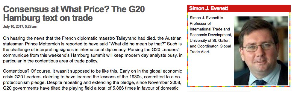 Consensus at What Price? The #G20 Hamburg text on #trade. Read this brief analysis from our advisor Simon Evenett: http://ow.ly/W23F30dwNjO pic.twitter.com/mNCHu069nJ