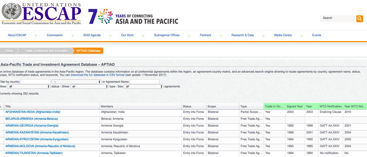 Update: #AsiaPacific #Trade and #Investment Agreement Database (APTIAD) - an search engine allowing to locate agreements by country, name, status, scope, WTO notification status, keywords & it's downloadable! (Last update: 1 Nov 2017)
