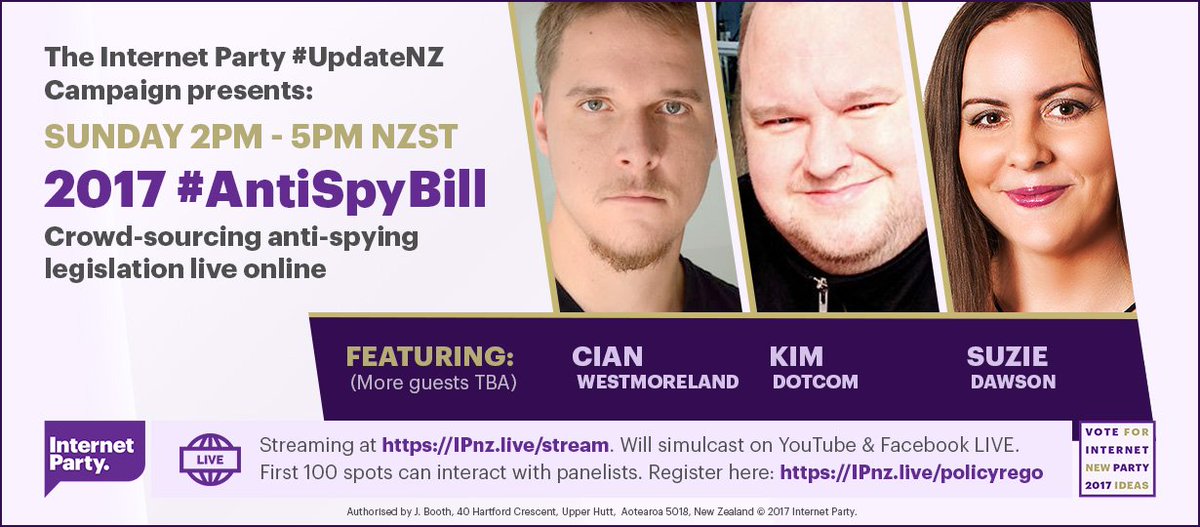#AntiSpyBill event goes livehttps://twitter.com/InternetPartyNZ/status/901596347303952385 …