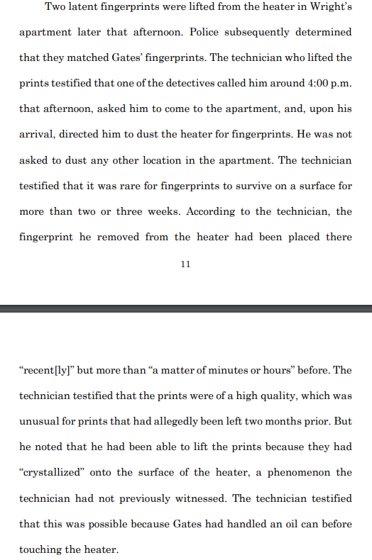Oh, also, Gates claimed that police took him to the victim's apartment and told him to touch the heater. That fingerprint evidence was a huge part of the State's case. The technician testified that police told him to dust ONLY that item in the apartment.pic.twitter.com/aq0qIUOTPI