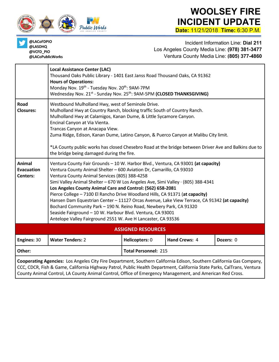 #WoolseyFire *FINAL UPDATE* Incident Fact Sheet for Sunday November 25th. For continued road closures and evacuation information view the map here: https://tinyurl.com/ycbwpdjb pic.twitter.com/mmzmm4RV3e