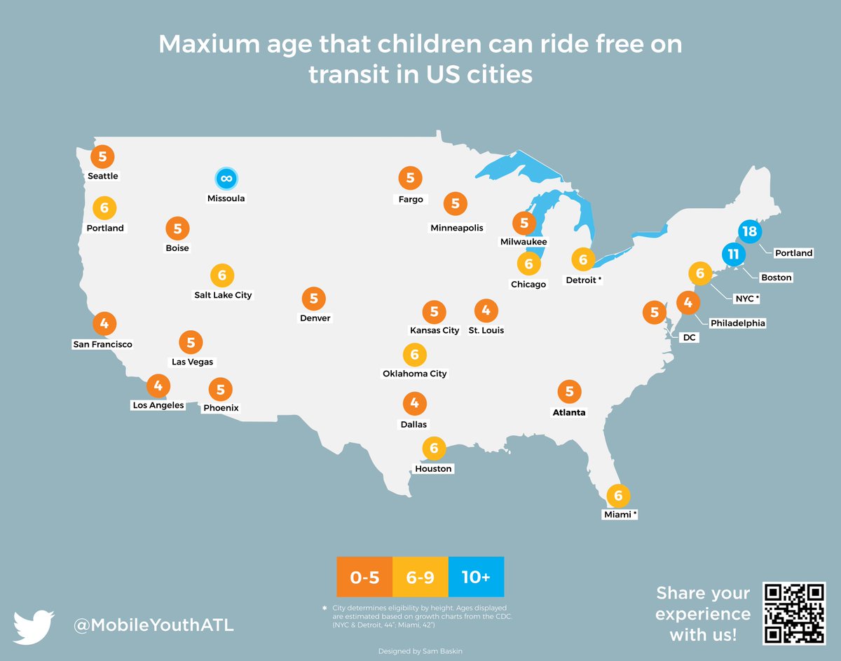 The very talented @Johnbaskin37 made this map to show the maximum age at which children ride transit free across US cities. Atlanta is fairly typical, but do we want to be typical -- or world-class??? Come see use at