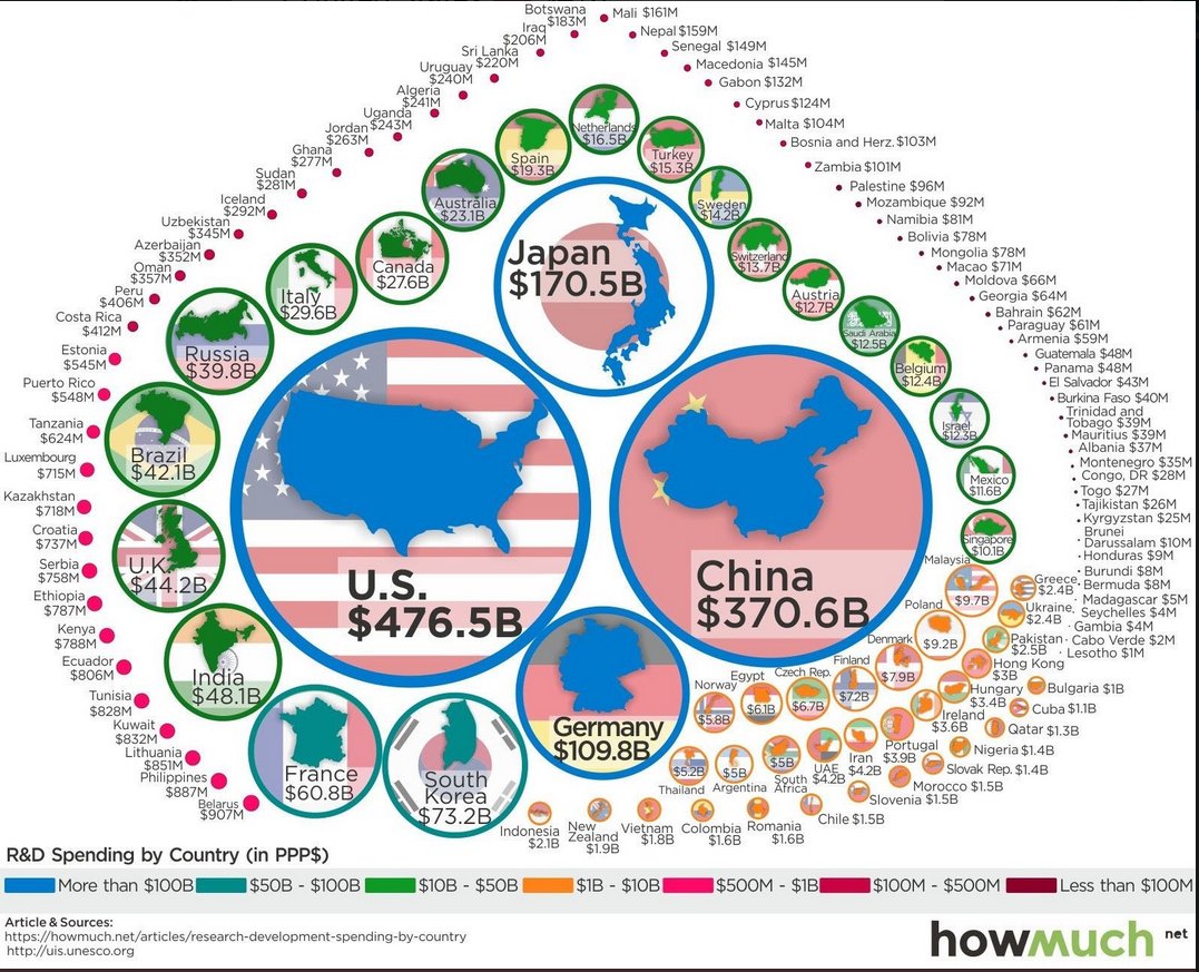Рейтинг стран по уровню расходов на научные исследования (НИОКР) в млрд долл): 1 США