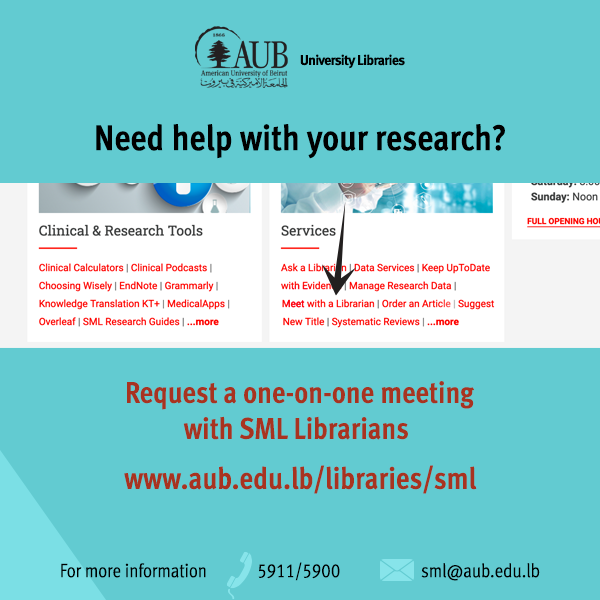 Working on a medical research paper? You need one-to-one assistance? Book an appointment via "Meet with a Librarian" on SML homepage (under Services) http://aub.edu.lb.libcal.com/booking/smlaptmt …