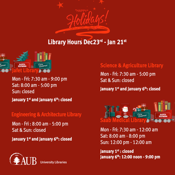 #AUBLibraries opening hours during this holiday season on our webpage: https://www.aub.edu.lb/Libraries/Pages/Hours.aspx …pic.twitter.com/UgCrqFvp4H