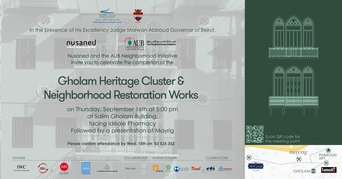 #AUB Neighborhood Initiative and Nusaned to celebrate the rehabilitation of the Gholam heritage cluster in Mar Mikhael, a beautiful example of architectural development in Beirut between 1840 and 1930 on Thursday, Sept 16 at 5:00 pm at Salim Gholam Building.@Nusanedorgpic.twitter.com/7HwXosNHpz