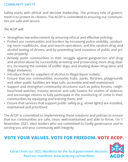 African Christian Democratic Party ● Modern, Conservative, Christian ● Full statements on Website & FB ● Manifestos & Constitution on website● info@acdp.org.za.