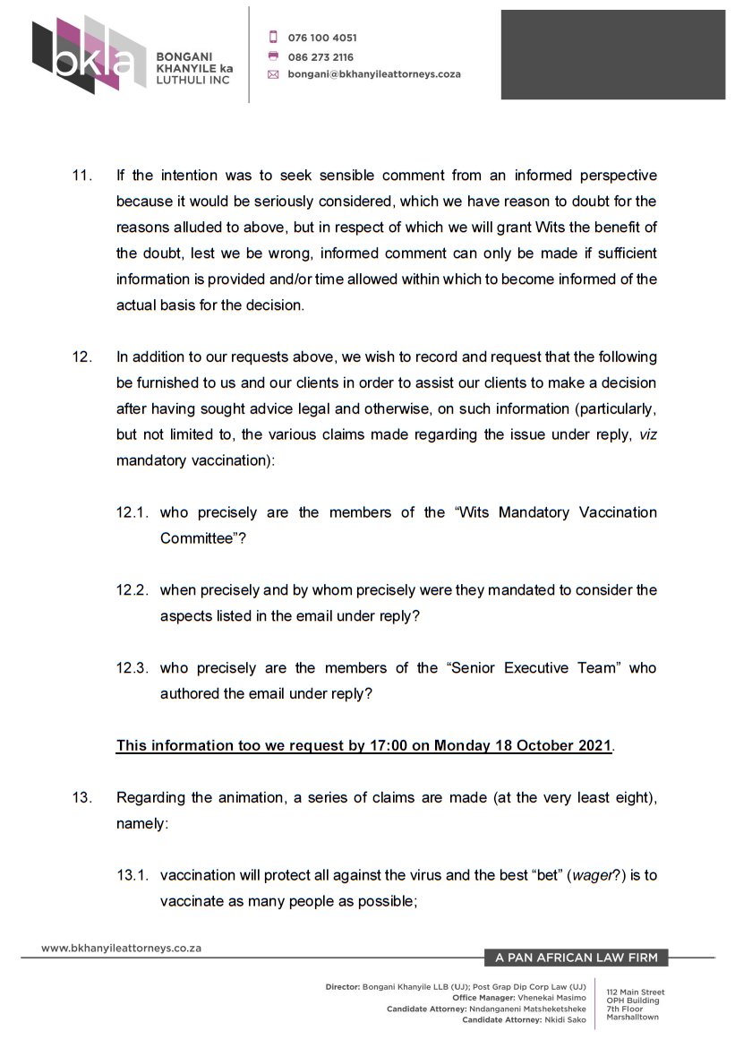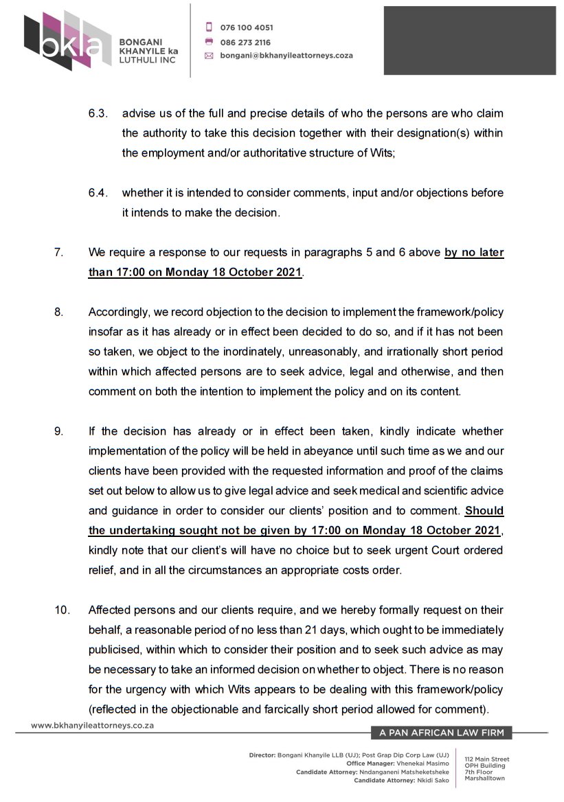 Our legal team has written to @WitsUniversity, acting on behalf of @Wits_SRC and #ACDP re the 'Wits Mandatory Vaccination Framework'. Below: pics of pg's 1 -4 only, the rest of the letter & the PDF is available at FB: https://bit.ly/3v7J3rv  & Website: https://bit.ly/3AC6SsN pic.twitter.com/LbrWGJwkSG