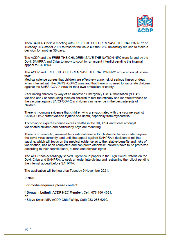 The ACDP’s matter, where we seek an interdict against the rollout of Covid vaccines for children, has been set down for Wednesday 10 Nov 2021 in the North Gauteng High Court before Justice Fourie at 10:15.https://twitter.com/A_C_D_P/status/1454159801169158150 …