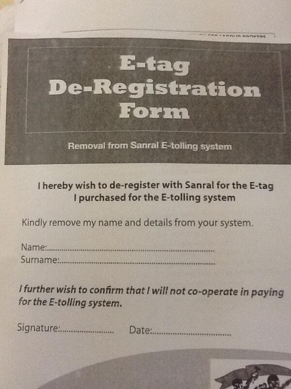 EWN reports that Cosatu has launched an e-tag "De-registration form" pic.twitter.com/7dcEW7K1Cg #etolls