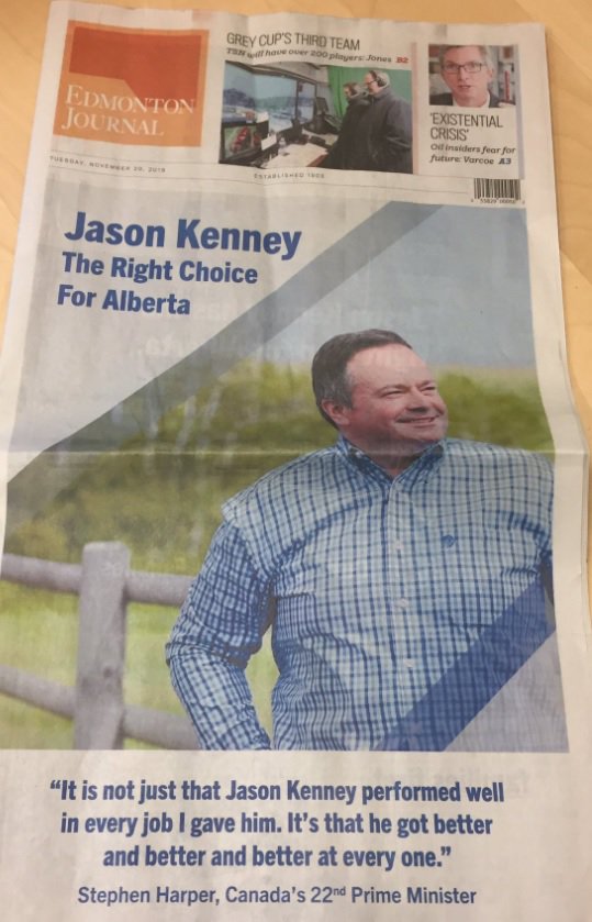 I worked at Metro Calgary when it published this front-page wrap (on election day!) in 2013. Reporters objected, of course, but were overruled. So I can imagine how editorial staff at the Edmonton Journal feel today. This stuff was unthinkable at newspapers not too long ago.pic.twitter.com/1zUqR37F73