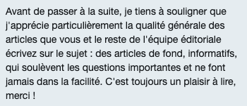 Autre qualité des publications, et non des moindres : l’orthographe et la grammaire impeccables. C’est tellement rare dans la presse, a fortiori digitale, que ça mérite vraiment d’être souligné