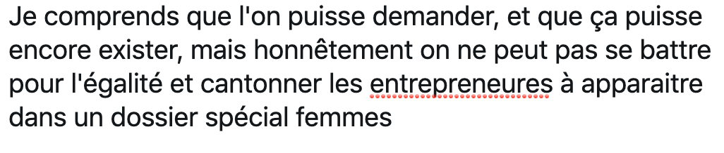 Et c'est en parlant d'ENTREPRENEURES au quotidien, qu'un jour prochain, le mot lui-même ne sera plus souligné en rouge car méconnu des correcteurs orthographiques (mais ça c'est un autre sujet)pic.twitter.com/U5xdqTWPcn