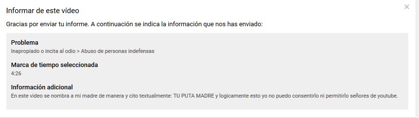 @TeamYouTube@YouTube@YouTubeEspanol por insultos no ya hacia mi o hacia mi persona como youtuber sino hacia un familiar mio intimo. Mi madre.pic.twitter.com/OExdGVzLUY
