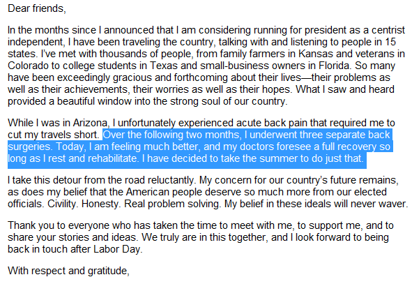 Howard Schultz issues a statement saying he has had 3 back surgeries and will be off the campaign trail this summer to recuperate.pic.twitter.com/swNLGKHf9r