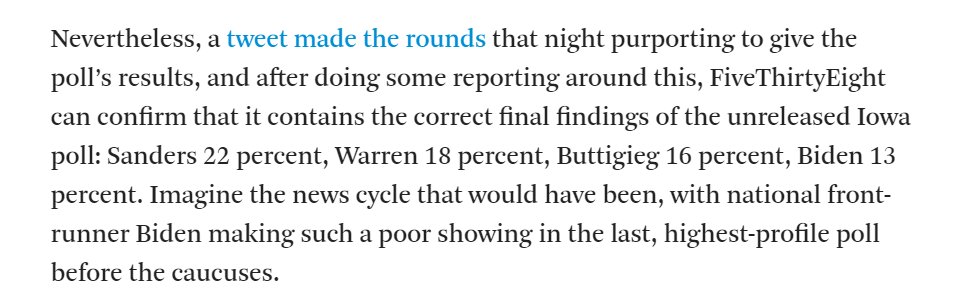 We can confirm the final results of the unreleased Iowa Poll: Sanders 22% Warren 18% Buttigieg 16% Biden 13%https://fivethirtyeight.com/live-blog/iowa-caucus-2020-election-live/254963/ …