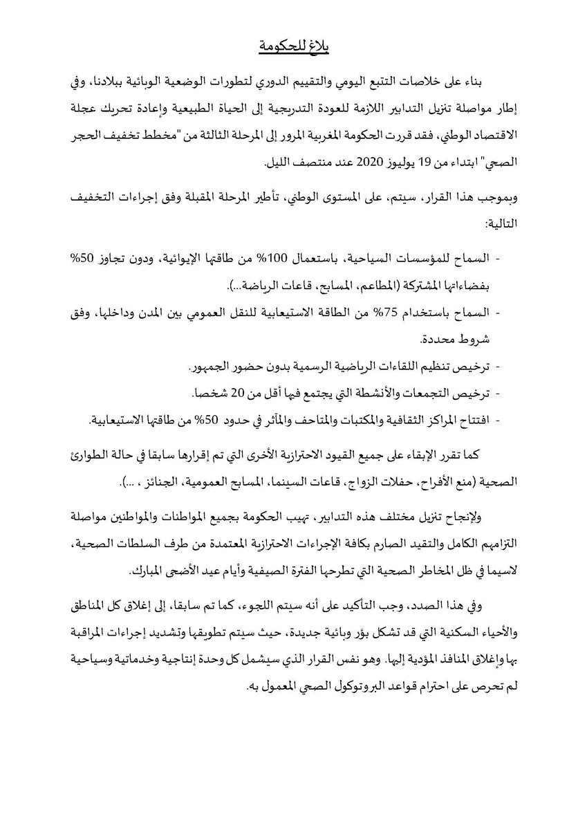قررت الحكومة المرور للمرحلة الثالثة من "مخطط تخفيف الحجر الصحي" ابتداء من يوم غد الاثنين. قرار اتخذ بناء على خلاصات التتبع اليومي والتقييم الدوري لتطورات الوضعية الصحية ببلادنا ومواصلة لتنزيل التدابير للعودة التدريجية للحياة العادية وإعادة تحريك عجلة الاقتصاد الوطني.pic.twitter.com/YoVvUygSpF