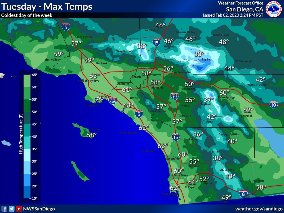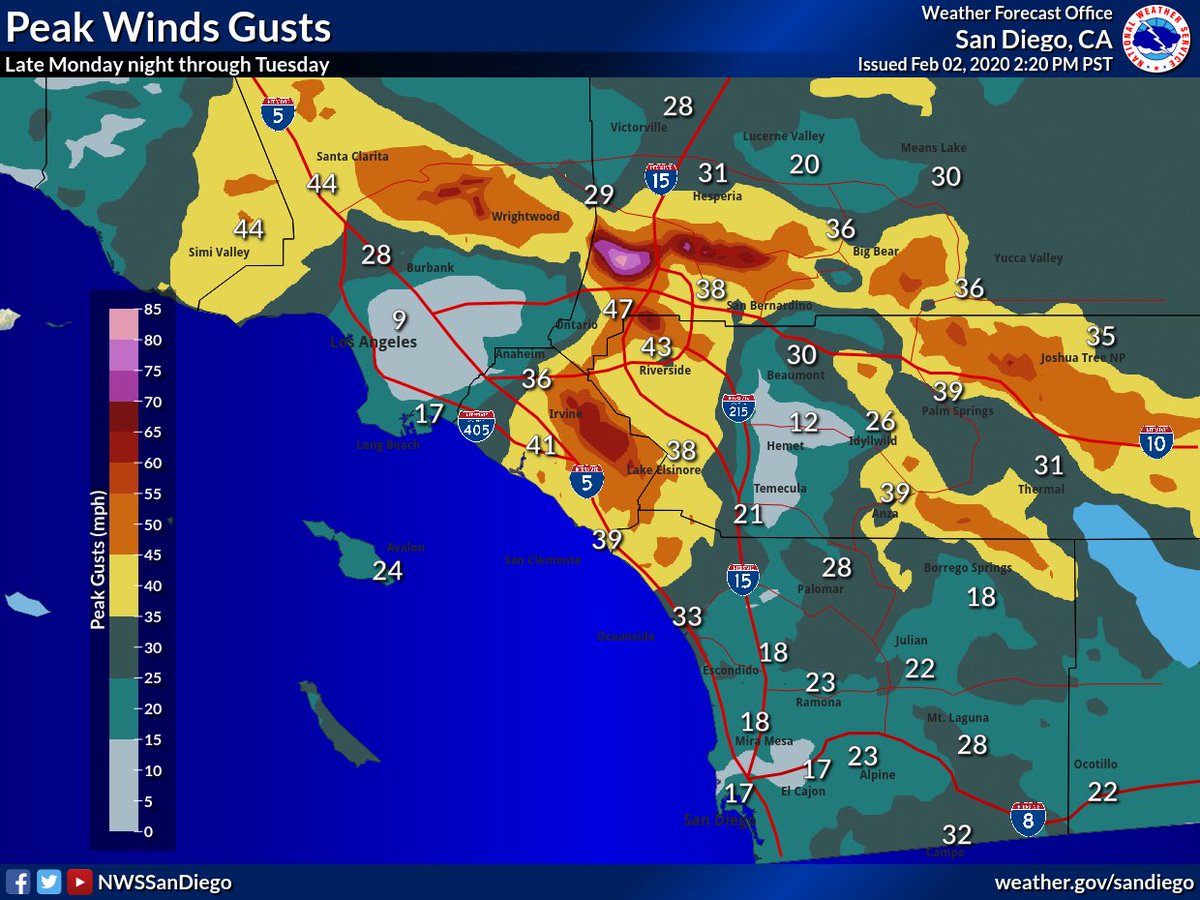 Strong winds impacted the mountains, foothills and deserts last night. The peak gust was 74 at CSU San Bernardino. For the mariners, the San Clemente Basin Buoy had a gust to 40 mph at 1:50 AM. https://nwschat.weather.gov/p.php?pid=202002031523-KSGX-NOUS46-PNSSGX …