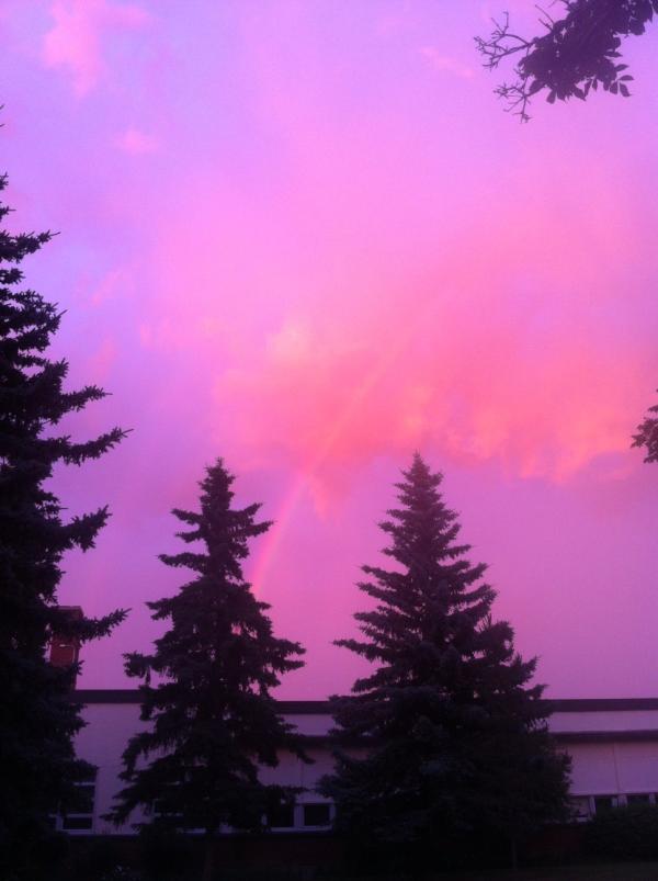 Rainbow in front of orange clouds in the east, at sunset. It's pretty, but kind of weird.