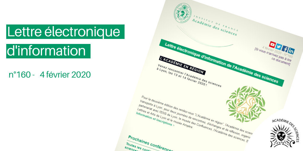 Ce mois-ci à la une de la lettre électronique d'information de l'@AcadSciences : L’Académie des sciences prend ses quartiers à Lyon les 13 et 14 février 2020 !