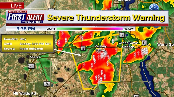 Severe TS Warning: until 4 pm for Central Clay County. Severe storm over Penny Farms producing damaging wind gust and quarter sized hail.