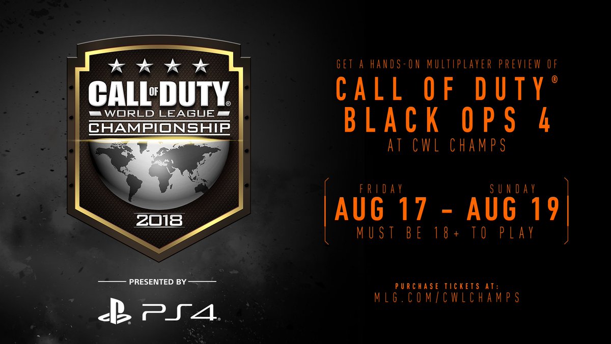 #BlackOps4 Multiplayer will be playable at 2018@CODWorldLeague Champs! Get your ticket for the grand event of the#CWLPS4 season: http://MLG.com/CWLChamps pic.twitter.com/3LddAVwsh2এই মিডিয়াতে সংবেদনশীল উপাদান থাকতে পারে। আরও জানুন