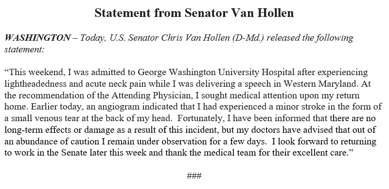 This weekend, after feeling lightheaded while delivering a speech, I sought medical attention at the recommendation of the Attending Physician. I’m feeling much better but will follow doctors' orders and curtail my schedule for the next few days. My full statement is below:pic.twitter.com/1sYq7FZMqS