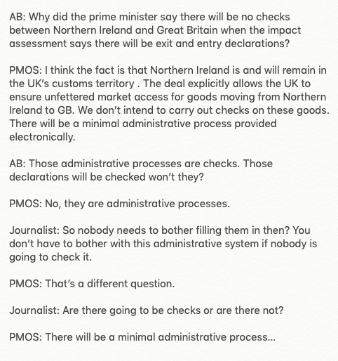 The government’s impact assessment says there will be import and exit declarations for goods traded across the Irish Sea. These declarations will be checked. Boris Johnson’s spokesman insists this doesn’t amount to checks.