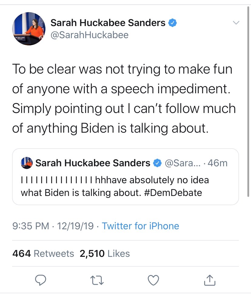 Apologies are pointless without changed behavior. She’s doubling down on her backed-up lie that it was about his policies and not the stutter itself. Didn’t realize you were this credulous/kind enough to give the benefit of the doubt to Her
