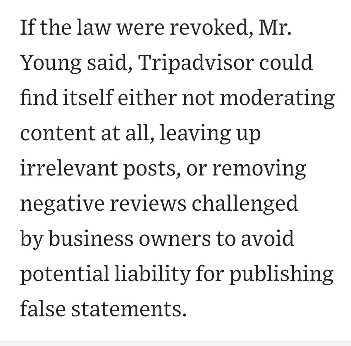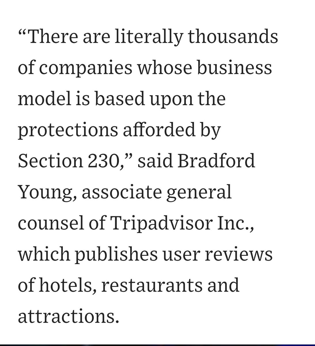 #Section230 repeal mean for small and mid-sized websites? Tripadvisor general counsel Bradford Young explains the likely result in this@WSJ article about how, "Social Media’s Liability Shield Is Under Assault." https://www.wsj.com/articles/social-medias-liability-shield-is-under-assault-11606402800 …pic.twitter.com/BqPAQQLKOR