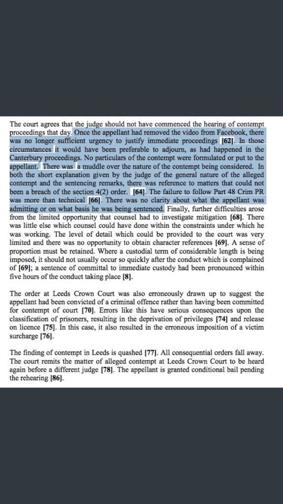 7/ Where does this leave us? Is this all an establishment conspiracy with political overtones. Clearly not. The first contempt finding in Canterbury was approved by the Court of Appeal which was clearly being fair and reasonable and not afraid to criticise judges below.