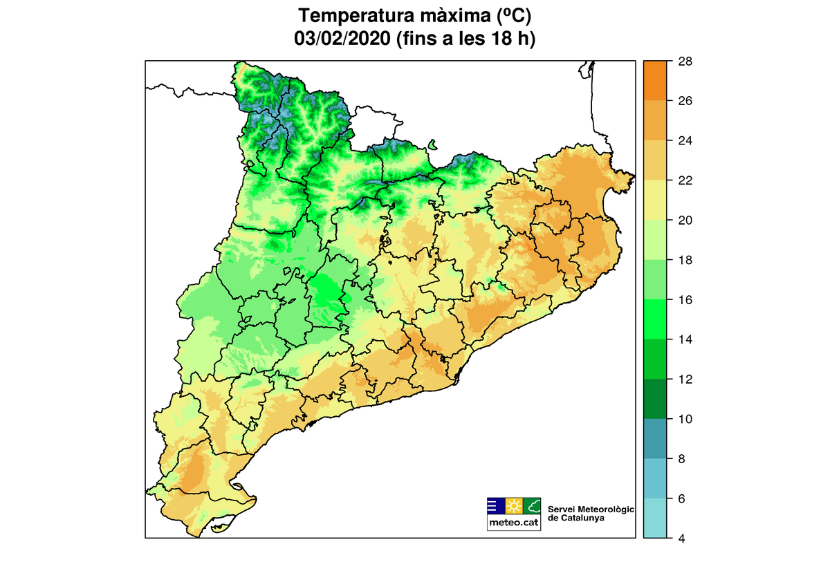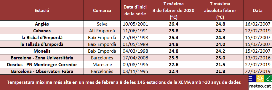 Rècord de temperatura màxima en un mes de febrer a 8 de les 146 estacions automàtiques de la XEMA que tenen >10 anys de dades. La majoria d'elles, situades entre el