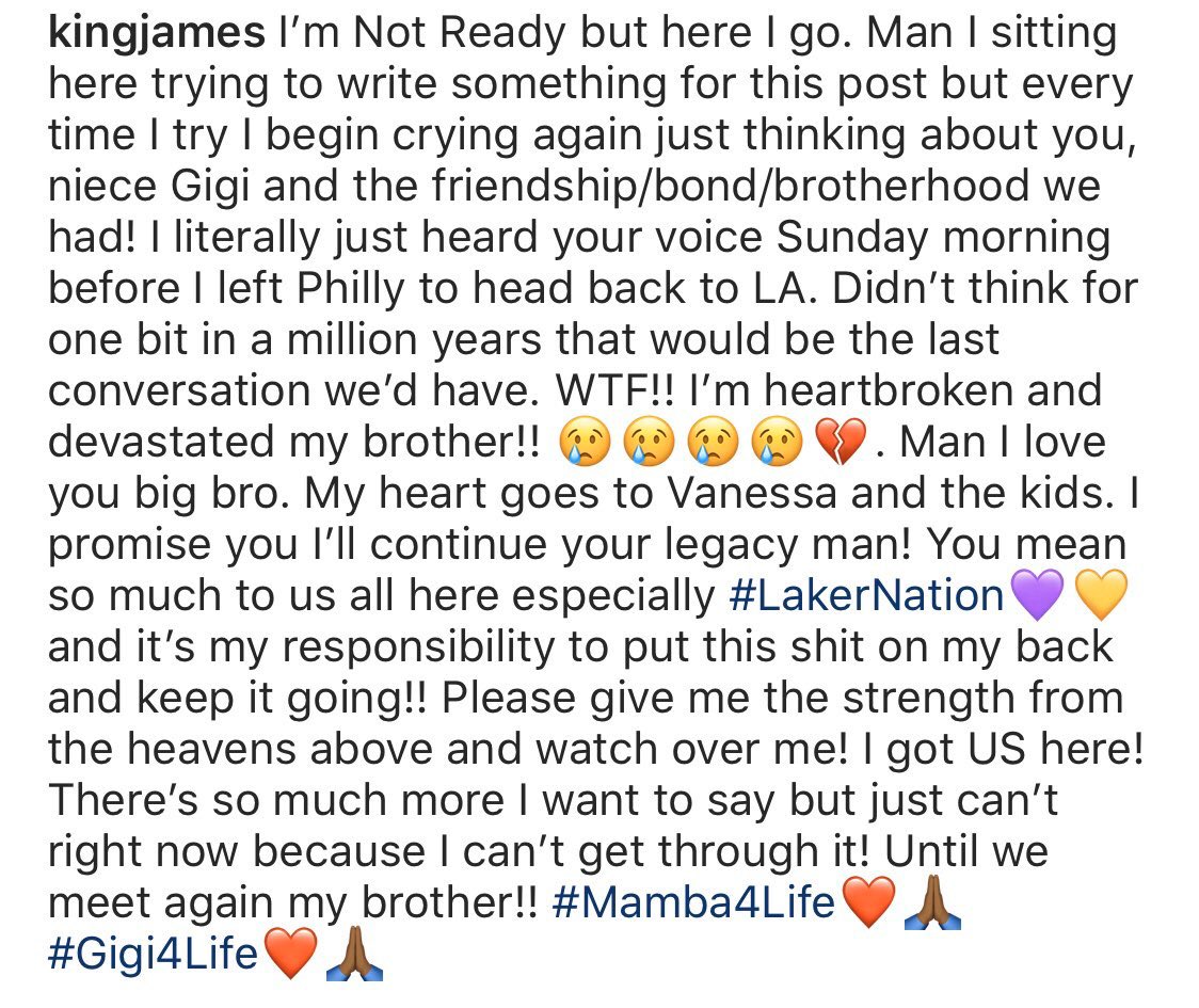 LeBron makes his first public comments on Kobe, says he’s been crying, “heartbroken & devastated.” He also promises to continue Kobe’s legacy: “it’s my responsibility to put this shut on my back & keep it going...I got US here.”pic.twitter.com/h7Fx3saBF6