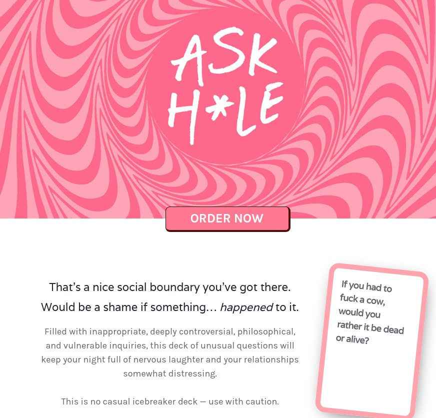 Aella@Aella_GirlReplying to @CassandraRulesA curious person, that's who. I'm curious about a huge variety of things that we consider taboo, hence my game http://askhole.io. Shaming curiosity is something I like to leave to religious zealots.askhole.ioAskhole: Open UpFilled with inappropriate, deeply controversial, philosophical, and vulnerable inquiries, this deck of unusual questions will keep your night on edge and your relationships queasy.This is no casual...9:35 PM · Jan 19, 20205 Likes
