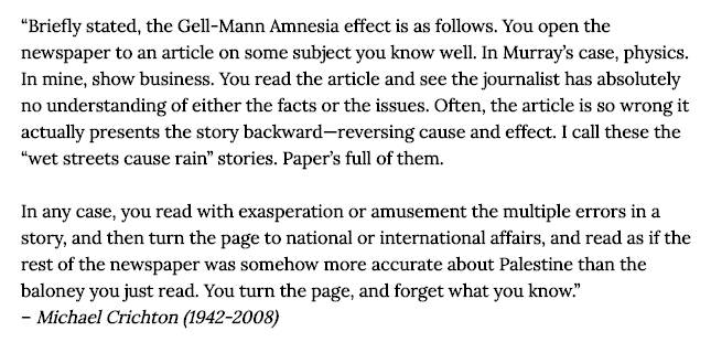 She's talking about avoiding gell-Mann amnesia in both areas. So it's not weird at all...