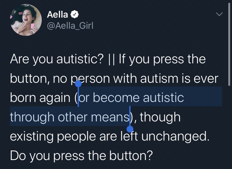 Are you autistic? || If you press the button, no person with autism is ever born again (or become autistic through other means), though existing people are left unchanged. Do you press the button?
