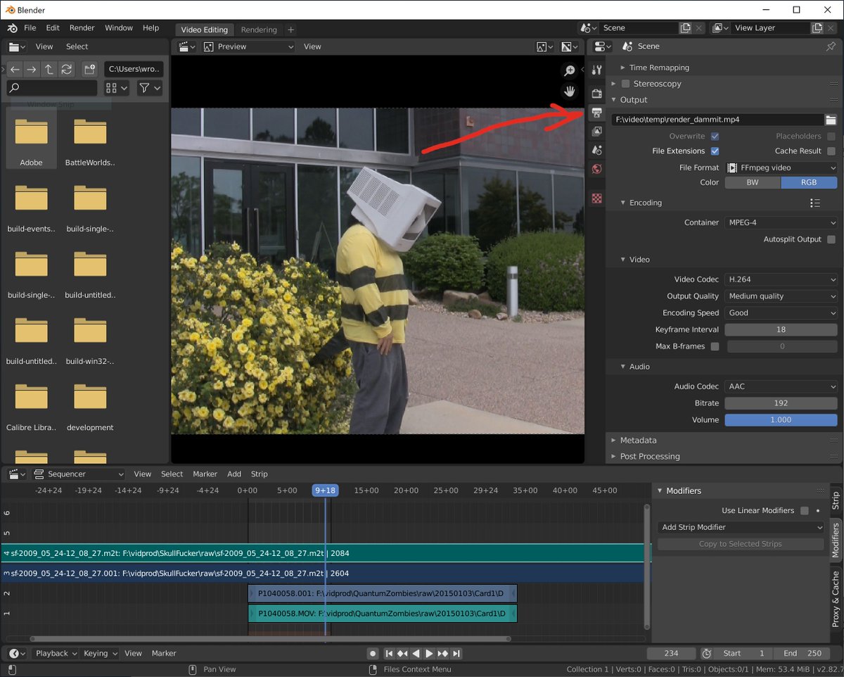 Most of the interesting bits are in the nonobvious "Output" tab. (arrow) Set res & duration to output (not inferred from the video on the sequence is!) File format, FFMPEG video, container MP4, codec H.264. Audio codec AC3, not "none." Then Render menu-"Render Animation"pic.twitter.com/y3gTijdWfA
