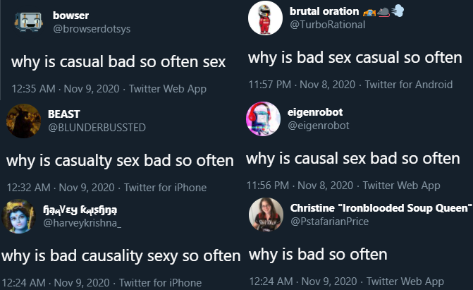 Aella@Aella_GirlReplying to @BecomingCritterI had no idea this was happening lol6:01 AM · Nov 9, 202016 Likes