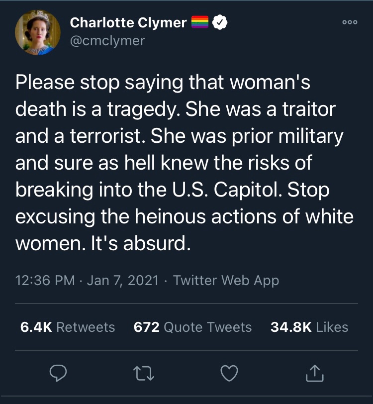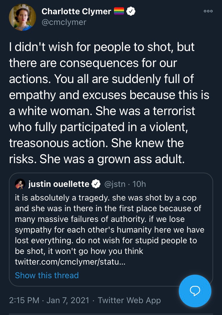 It's so viscerally infuriating. To see intelligent people like yourself and Sarah make such a blatant false equivalence. This was someone breaking into the Capitol and warned repeatedly to back down. Compare to the cases that inspired BLM.