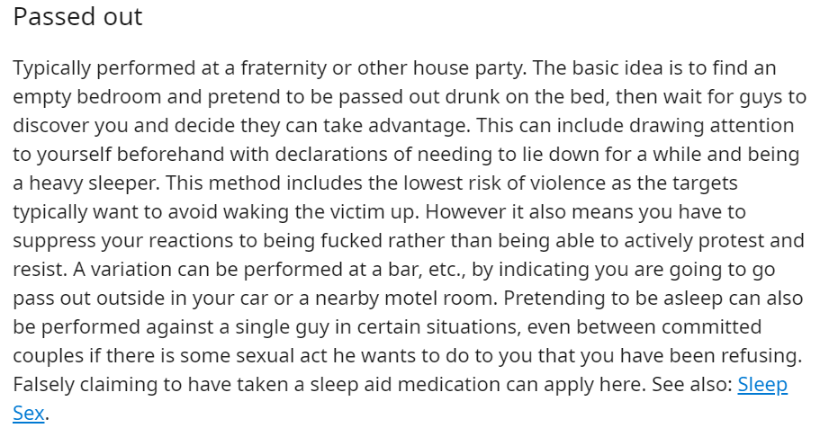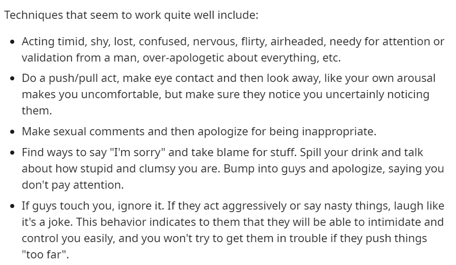 This corner of the internet is absolutely fascinating - a tutorial for women who are trying to get raped. It refers to rapists as 'targets', gives tips on how to increase your chances of being raped, and how to identify the men most likely to rape you https://www.reddit.com/r/rapekink/wiki/baitingmethods …pic.twitter.com/t4q5JbW4e7