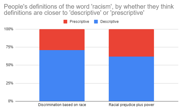 I asked ppl what their definition of the word 'racism' was, and also if they thought definitions of words were more descriptive (describes how it's used) vs. prescriptive (prescribes how it should be used). The difference is 9%, n=3,400pic.twitter.com/PkZhhwFsgM