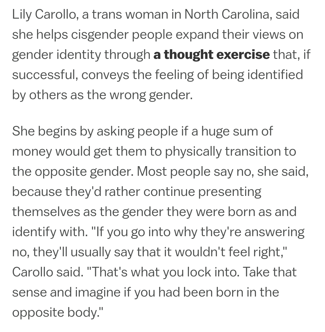 Trans advocates ask a variant question to help people understand what it's like to be trans. People say no even if offered a "huge sum of money" as a reward for the hypothetical transition.https://twitter.com/__rowboat__/status/1286792985808535552 …
