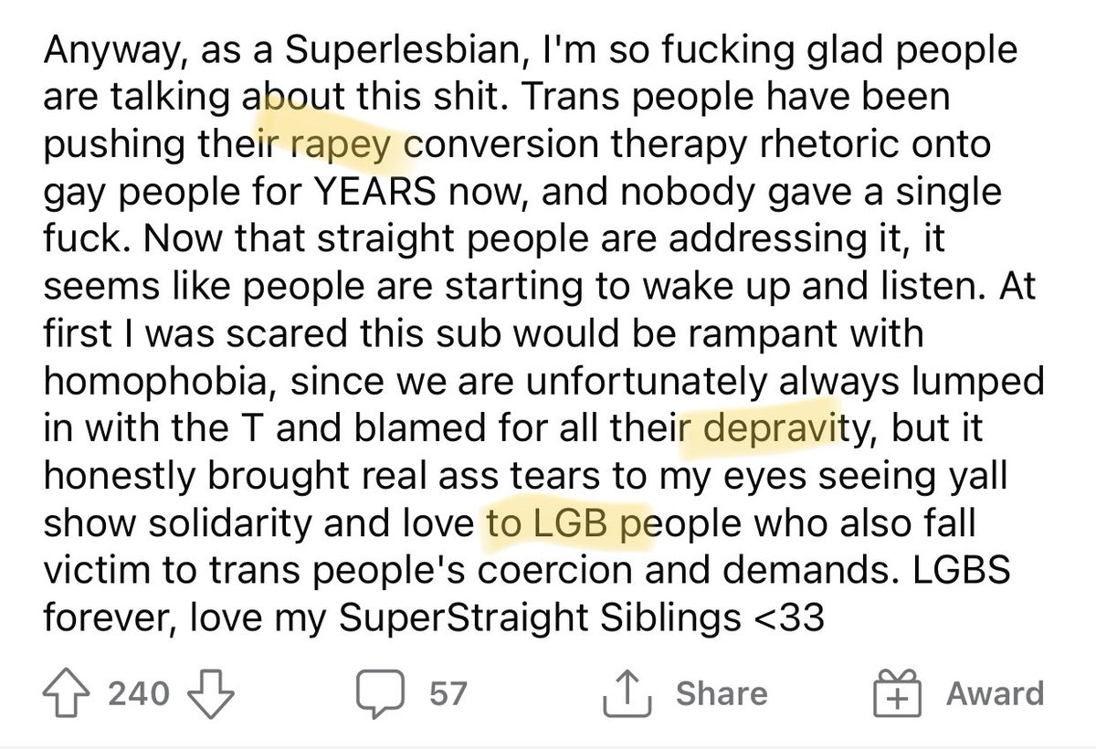 so some people wanted a term for being attracted to "opposite gender, opposite genitals", and called it superstraight. the internet, of course, reacted very reasonably, did not proceed to call them horrific transphobes, and reaffirmed any sexual preference is valid. ....right?